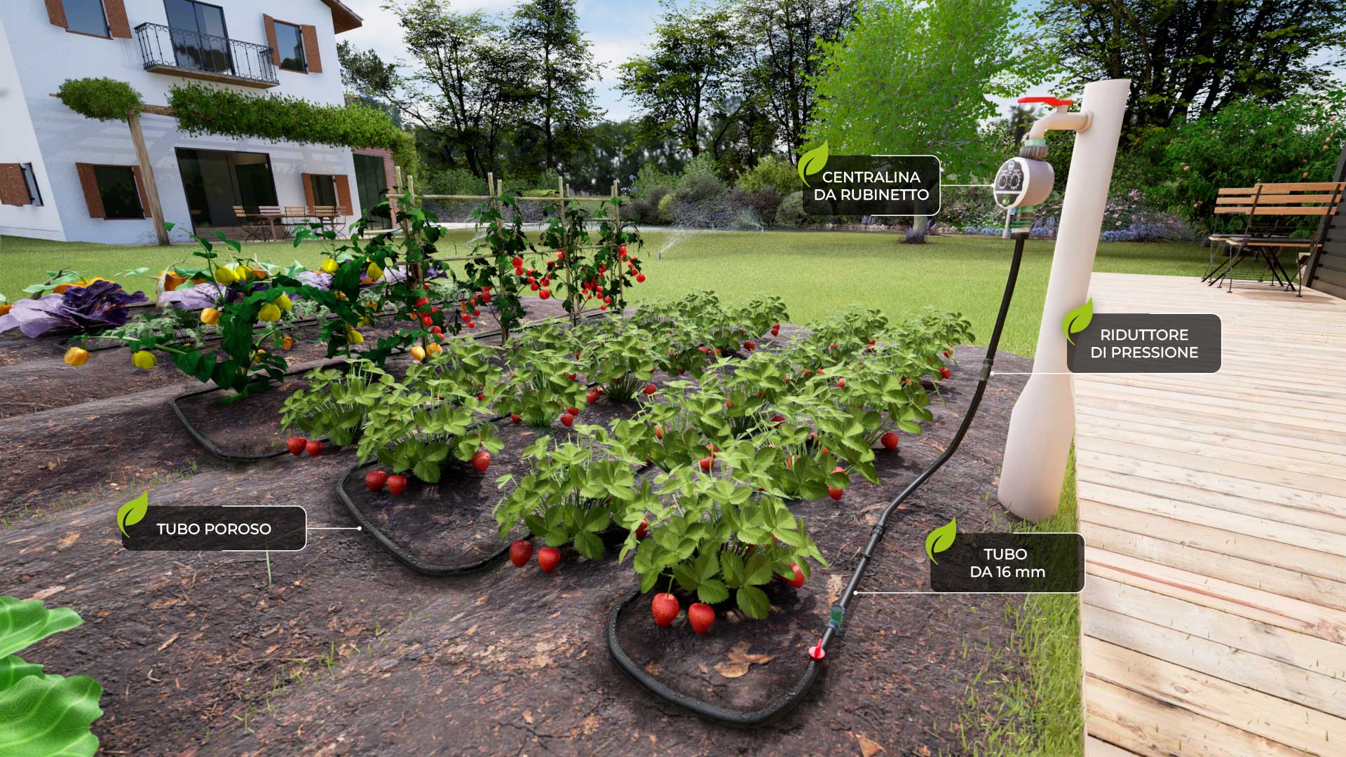 Najprecizniji način zalijevanja živica, cvjetnjaka i povrtnjaka. Voda ide izravno do korijena, što sprječava razvoj korova i bolesti listova.