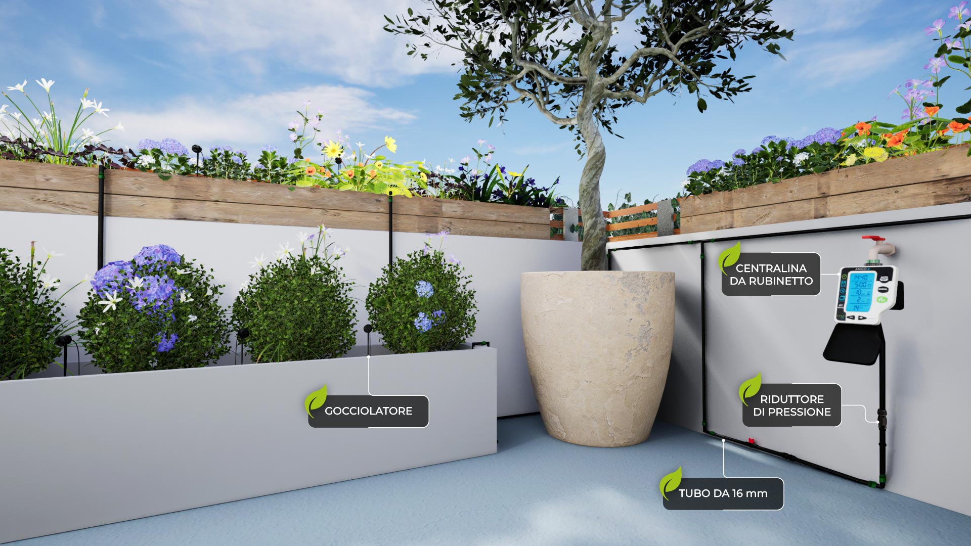 Zahvaljujući Amico+ kontroleru stvorena je nova brza i učinkovita metoda programiranja kontrolera u 'tri jednostavna koraka'. Unesite vrijeme navodnjavanja, koliko dugo i koliko često i programiranje sustava je dovršeno. Ovo je posebno prikladno za navodnjavanje malih terasa i balkona.