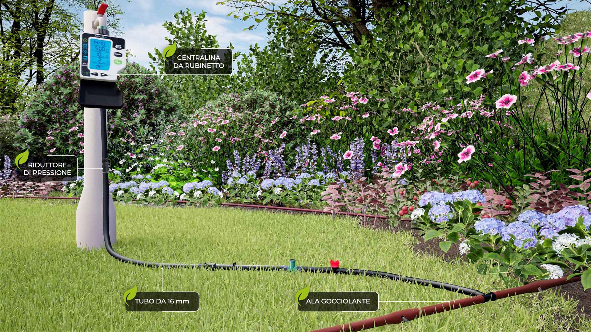 Zahvaljujući Amico+ kontroleru stvorena je nova brza i učinkovita metoda programiranja kontrolera u 'tri jednostavna koraka'. Unesite vrijeme navodnjavanja, koliko dugo i koliko često i programiranje sustava je dovršeno. Ovo je posebno prikladno za navodnjavanje malih terasa i balkona.